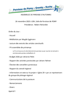 Vous êtes les bienvenus à cette assemblée le mercredi 26 Novembre à 20h à la salle de paroisse de Pomy.